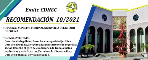 La Comisión de Derechos Humanos del Estado de Colima (CDHEC), emitió la Recomendación 10/2021, dirigida al Presidente del Supremo Tribunal de Justicia del Estado de Colima, por vulnerar los derechos humanos de las y los ciudadanos trabajadores de confianza, jubilados y pensionados ante el incumplimiento de su pago.
