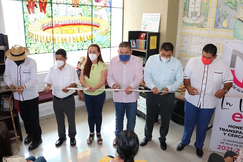 Al término de la conferencia de prensa, acompañada por el Síndico José Santos Dolores, el Regidor Guillermo Toscano y por el Secretario del Ayuntamiento, Alfredo Chávez, la Presidenta Tey Gutiérrez inauguró en Palacio Municipal una sala de lectura, como parte del programa “La Villa se lee”.