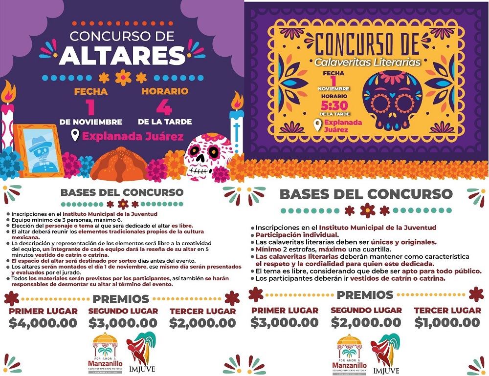 Y para seguir fortaleciendo nuestras tradiciones, el ayuntamiento de Manzanillo invita a participar en el Concurso de Calaveritas Literarias, que se llevará a cabo en la Explanada Juárez este 01 de noviembre a las 5 de la tarde, éstas deberán ser únicas y originales, de 2 estrofas como mínimo y una cuartilla como máximo, deberán mostrar respeto a quien se dedique y apta para todo público, el participante deberá acudir vestido de catrina o catrín, el primer lugar obtendrá 3 mil pesos, el segundo 2 mil y el tercero 1 mil pesos como premio.