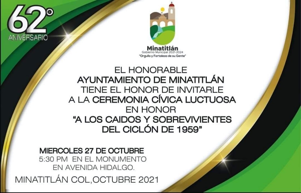 Minatitlán, Col. En Minatitlán, este miércoles 27 de octubre a las 5:30 de la tarde en el Monumento situado en avenida Hidalgo, se realizará la ceremonia cívica luctuosa en honor a los caídos y los sobrevivientes del Ciclón de 1959 en su 62 aniversario, fenómeno natural que desbastó al municipio y dejó una cantidad significativa de fallecidos.