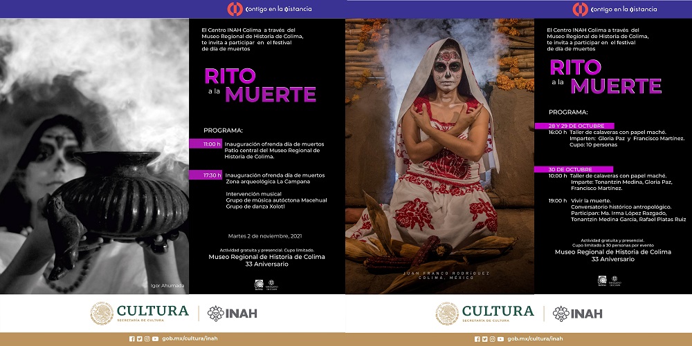 En el marco de esta celebración, el Centro INAH Colima y el Museo Regional de Historia de Colima, han preparado Rito a la muerte, festival de día de muertos, con actividades presenciales y virtuales para que la población colimense participe y conozca de nuestras tradiciones.
