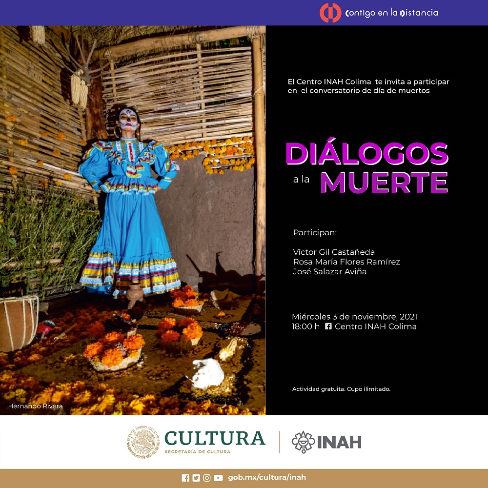 Para finalizar la agenda de este festival, el miércoles 3 de noviembre, a las 18:00 horas, mediante transmisión en vivo por la página oficial de facebook del Centro INAH Colima, se llevará a cabo el conversatorio Diálogos a la muerte, en el que se conocerá, desde distintas ópticas, las tradiciones, rituales y acciones en de día de muertos, desde la época prehispánica a la actualidad. Participarán en este conversatorio Víctor Gil Castañeda, Rosa María Flores Ramírez y José Salazar Aviña.