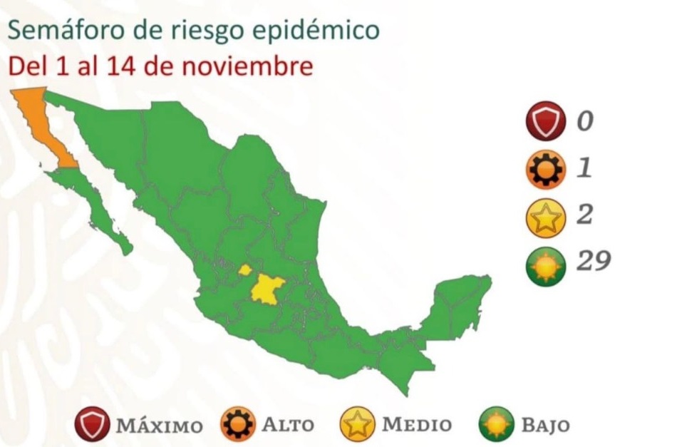 Además de los 29 estados en verde, dos están en color amarillo (riesgo moderado) y uno, Baja California se encuentra en anaranjado (riesgo alto).