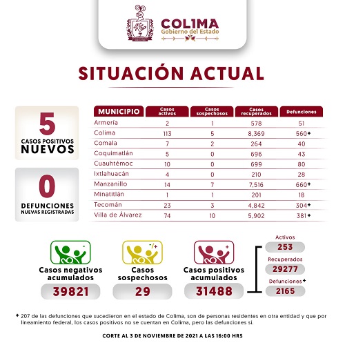 Las instituciones del Sector Salud reportan que la última jornada, se registraron 5 nuevos casos por Covid-19, con lo que la entidad alcanza 31 mil 488 positivos acumulados por esta causa.