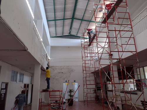 Los trabajos de rehabilitación del Palacio Municipal constan de resane y pintura del interior y exterior del edificio, reparación de baños, reposición y mejoramiento de luminarias de los espacios de trabajo, reparación y mantenimiento de climas y equipo de oficina, todo para servir mejor al pueblo de Coahuayana, como es la intención e instrucción del alcalde Gildardo Ruiz.