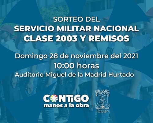 El Ayuntamiento de Colima que preside Margarita Moreno informa que este domingo 28 de noviembre se realizará en el auditorio Miguel de la Madrid Hurtado, a las 10 de la mañana, el sorteo para el servicio militar.
