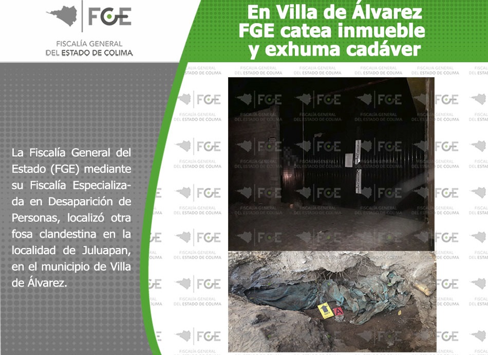 Villa de Álvarez, Col. La Fiscalía General del Estado (FGE) mediante su Fiscalía Especializada en Desaparición de Personas, localizó otra fosa clandestina en la localidad de Juluapan, en el municipio de Villa de Álvarez.