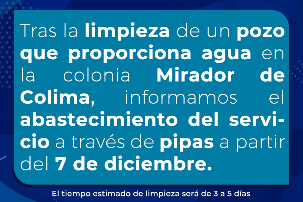La Comisión Intermunicipal de Agua Potable y Alcantarillado Colima Villa de Álvarez (Ciapacov) informa sobre la programación del mantenimiento al pozo profundo “Mirador de Colima” el cual abastece a las colonias: Mirador de Colima, Diamante, Margaritas y parte norte de Antorchista, con el fin de evitar posteriores deficiencias en el servicio y cuya limpieza durará un tiempo estimado de 3 a 5 días dependiendo el estado del pozo, comenzando el martes 7 de diciembre y culminando entre viernes y sábado.