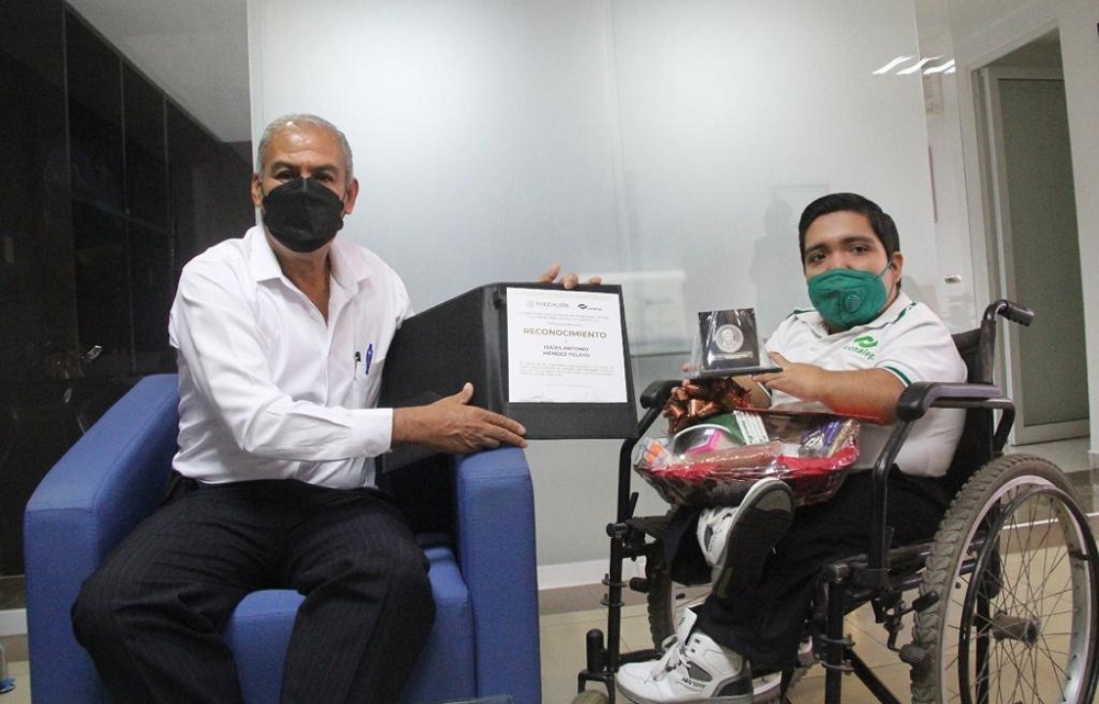 El secretario de Educación y Cultura, Adolfo Núñez González, felicitó a Isaías Antonio Méndez Pelayo, alumno del quinto semestre de la carrera de Contabilidad, del plantel 061 del Colegio Nacional de Educación Profesional Técnica (Conalep), Profesor Gustavo Alberto Vázquez Montes, quien fue reconocido con la presea “Bernardo Quintana Arrioja 2021” en la categoría de Valor.