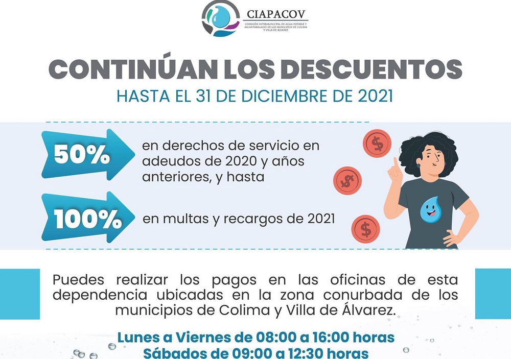 La Comisión de Agua Potable y Alcantarillado de los municipios de Colima y Villa de Álvarez (CIAPACOV) invita a pobladores de ambos municipios, a aprovechar la última semana de descuentos del fin de año, para que puedan ponerse al corriente en sus adeudos.