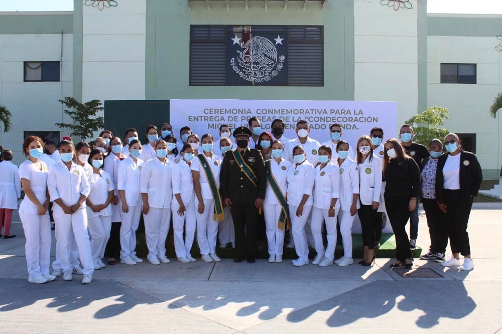 Personal de salud que atiende el área Covid-19 que se encuentra instalada en el 29 Batallón de infantería de la 20ª. Zona Militar recibieron, este miércoles, la Presea “Miguel Hidalgo” en grado banda por su entrega frente a la pandemia.