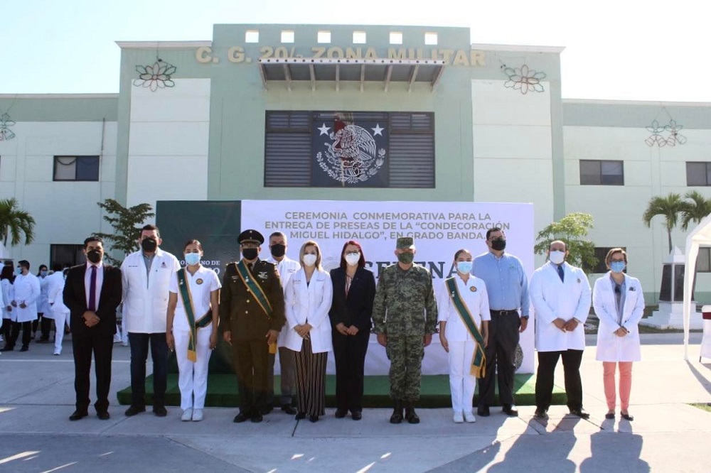 La ceremonia de entrega de preseas de esta Condecoración se realizó en las instalaciones de la 20 Zona Militar, en donde la titular de la Secretaría de Salud, Martha Janeth Espinosa Mejía, el General de Brigada D.E.M. Héctor Manuel Valles colocaron la Presea “Miguel Hidalgo” en grado banda al Mayor Médico Militar Clodoaldo Nario Arismendi y a las enfermeras Dalia Libier Figueroa Méndez y Grisel Rodríguez Aguirre.