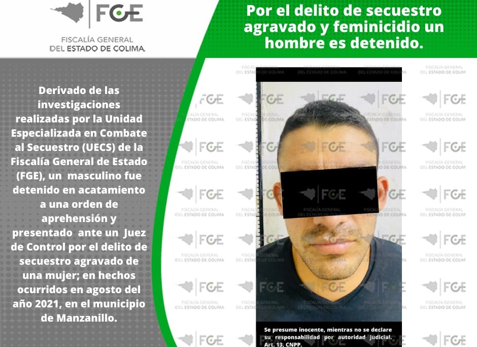 Derivado de las investigaciones realizadas por la Unidad Especializada en Combate al Secuestro (UECS) de la Fiscalía General de Estado (FGE), un masculino fue detenido en acatamiento a una orden de aprehensión y presentado ante un Juez de Control por el delito de secuestro agravado de una mujer; en hechos ocurridos en agosto del año 2021, en el municipio de Manzanillo.