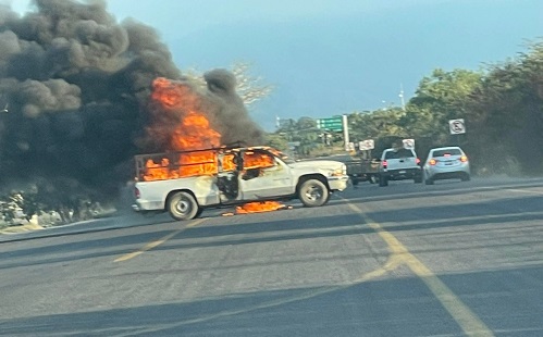 TECOMÁN, Col., 5 de enero de 2022.- Este miércoles por la tarde, en las inmediaciones de la gasolinera de Cerro de Ortega, sujetos desconocidos se apropiaron de una camioneta pick up a la que incendiaron sobre la cinta asfáltica de la carretera, para luego huir con rumbo desconocido.