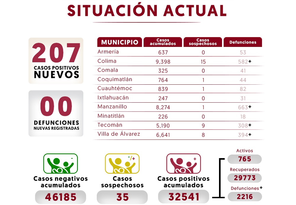 Las instituciones del Sector Salud reportan que la última jornada, se registraron 207 nuevos casos por Covid-19, con lo que la entidad alcanza 32 mil 541 positivos acumulados por esta causa.