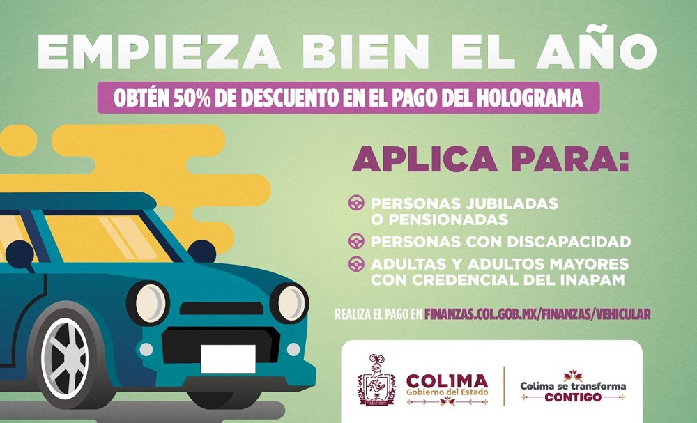 El Gobierno del Estado a través de la Secretaría de Planeación, Finanzas y Administración, invita a las y los colimenses para que en este ejercicio fiscal 2022 aprovechen el descuento del 50 por ciento en el pago de la Calcomanía Fiscal Vehicular.