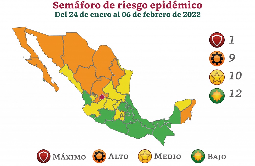 El semáforo epidemiológico señala que 12 estados de la República Mexicana se encuentran en color verde, mientras que 10 en color amarillo, 9 en anaranjado y solo uno, que es Aguascalientes, en color rojo o riesgo máximo.