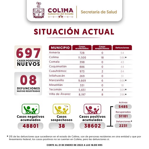 La Secretaría de Salud informa que las 8 defunciones ocurrieron en 6 hombres -2 de ellos foráneos-, y 2 mujeres, mayores de 65 años de edad; 6 estaban hospitalizados graves, uno no grave y uno intubado. Por residencia, 2 eran originarios de Colima, 2 de Cuauhtémoc, 1 de Manzanillo, 1 de Villa de Álvarez, mientras que los 2 foráneos eran atendidos en Colima y Manzanillo.