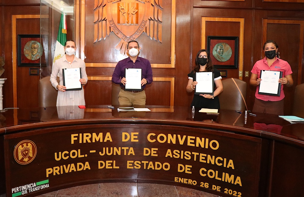 Con el propósito de compartir experiencias adquiridas y ofrecer nuevos espacios de formación para las y los estudiantes, este miércoles la Universidad de Colima, representada por su rector, el Dr. Christian Jorge Torres Ortiz Zermeño y la Junta de Asistencia Privada (JAP) del estado, a cargo de la Ing. María Luisa González André, firmaron un convenio de colaboración que beneficiará también a las más de 73 mil personas que atienden las 70 instituciones agrupadas en esta junta.