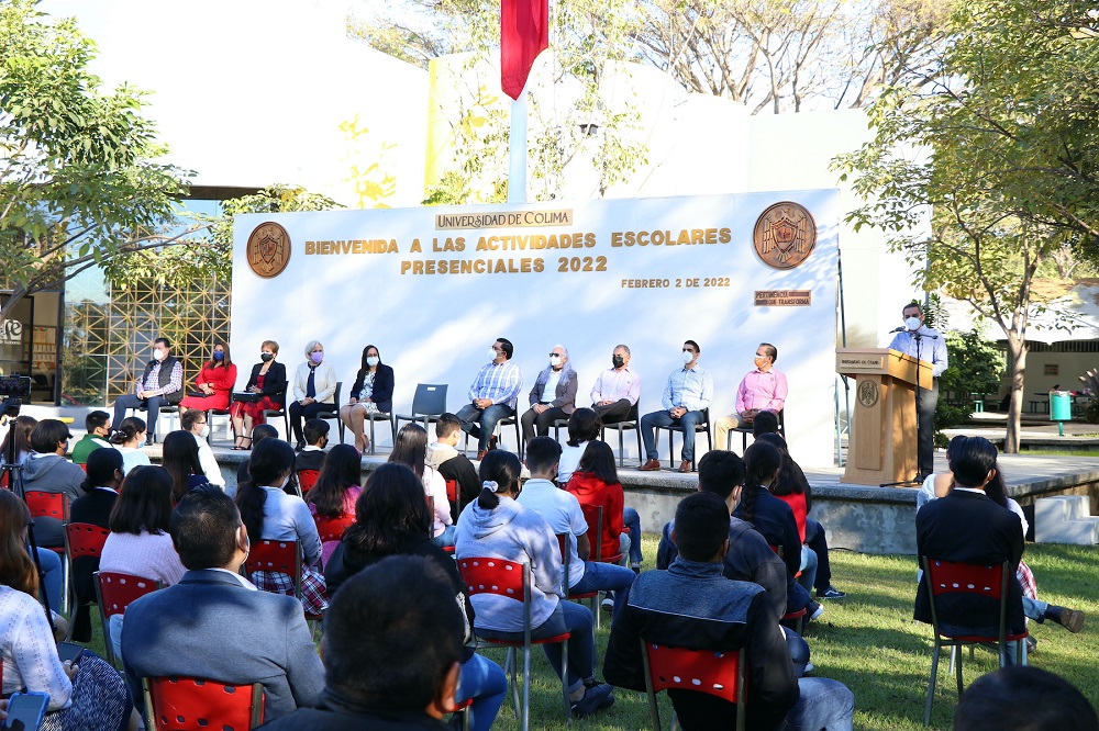 Con la presencia en vivo de estudiantes, docentes, directivos y funcionarios, este miércoles la Universidad de Colima inauguró de manera oficial las actividades escolares presenciales del semestre febrero-agosto de 2022, en una de las explanadas del campus Villa de Álvarez, con una ceremonia que se transmitió por internet a todos los campus y planteles de la institución.