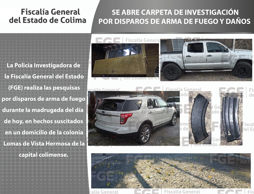 La Policía Investigadora de la Fiscalía General del Estado (FGE) realiza las pesquisas por disparos de arma de fuego durante la madrugada del día de hoy, en hechos suscitados en un domicilio de la colonia Lomas de Vista Hermosa de la capital colimense.