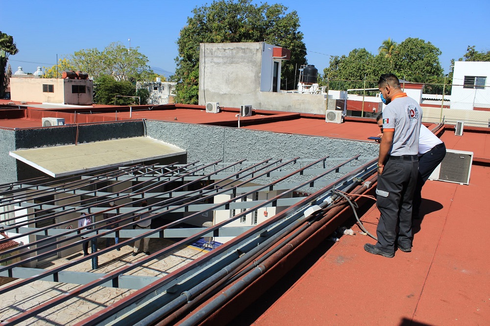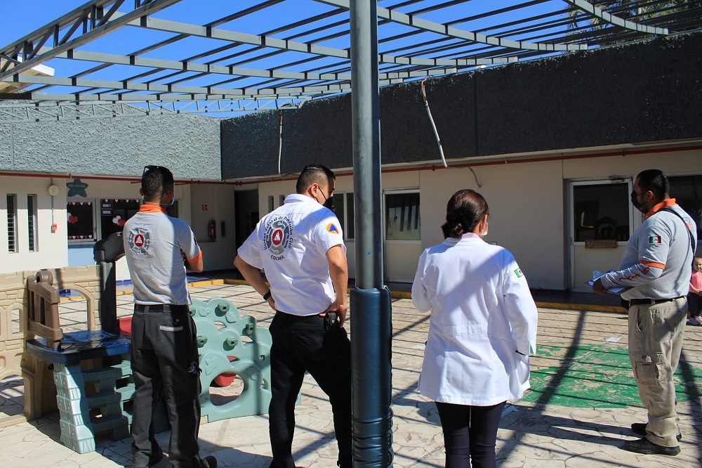 Personal de la Unidad Estatal de Protección Civil de Colima acudió este martes a las instalaciones de la Estancia para el Bienestar y Desarrollo Infantil No. 80 (Guardería del ISSSTE), para realizar la inspección de una estructura metálica localizada en el patio del edificio.
