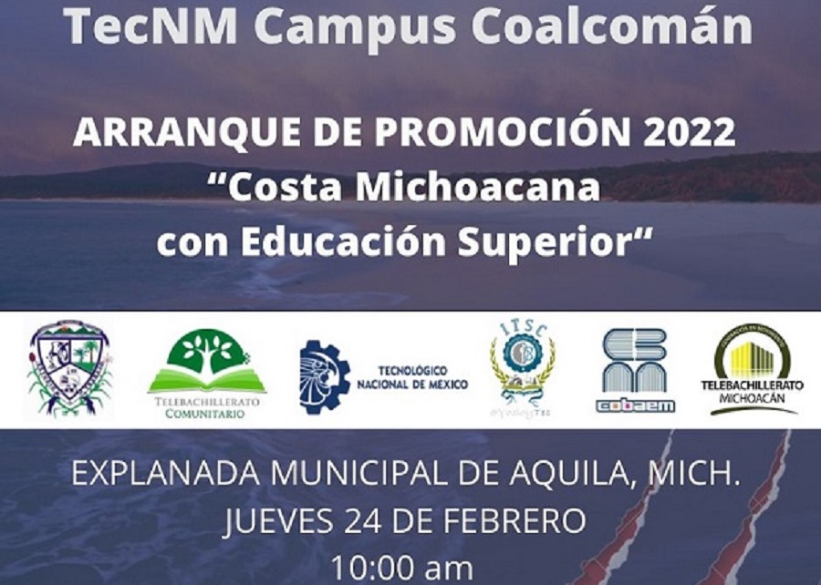 Coalcomán, Mich. A través de sus redes sociales, el Tecnológico Nacional de México, campus Coalcomán, dio a conocer que este 24 de febrero realizará un arranque de promoción en el municipio de Aquila denominado “Costa Michoacana con educación superior”, con el objetivo de incentivar la Educación Superior en las y los jóvenes de la región de la costa / sierra nahua y de generar en estudiantes de educación Media Superior la inquietud por la #INGENIERIA, reducir la #deserción y promover el gusto e interés por estudiar una carrera profesional en las futuras generaciones.