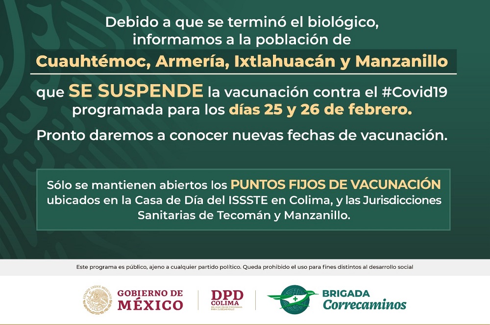 Lo anterior se dio a conocer mediante redes sociales, en donde se indica que “Debido a que se terminó el biológico informamos a la población de Cuauhtémoc, Armería, Ixtlahuacán y Manzanillo que se suspende la vacunación contra el Covid 19programada para los días 25 y 26 de febrero”.