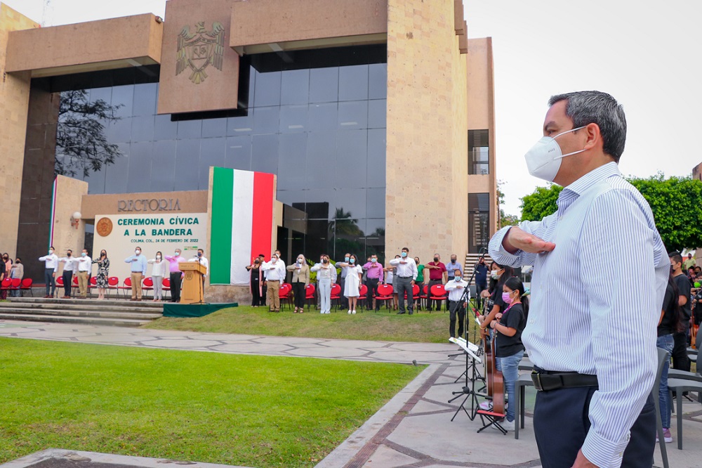 La ceremonia por el Día de la Bandera “simboliza la unión que como universitarios y mexicanos tenemos en torno a un proyecto común para la construcción de un país libre y democrático”, dijo el rector de la Universidad de Colima, Dr. Christian Jorge Torres Ortiz Zermeño este jueves luego de izar la bandera en la explanada de rectoría, acompañado por las escoltas de la Facultad de Ciencias de la Educación y del Bachillerato 32, así como por las Bandas de Guerra de los Bachilleratos 1, 4 y 25.