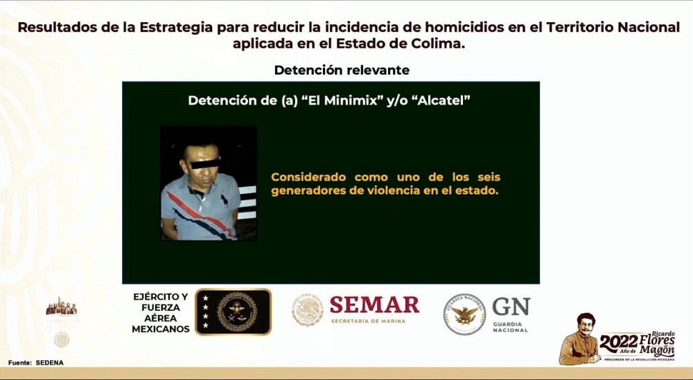 Al estar dando a conocer las acciones emprendidas y los resultados obtenidos en Colima para disminuir los hechos violentos y delitos en el estado, el titular de la Secretaría de la Defensa Nacional (SEDENA) Luis Crescencio Sandoval López, mencionó que entre uno de los resultados, se tiene la detención del “Minimix” y/o “Alcatel” considerado como uno de los seis generadores de violencia en el estado.