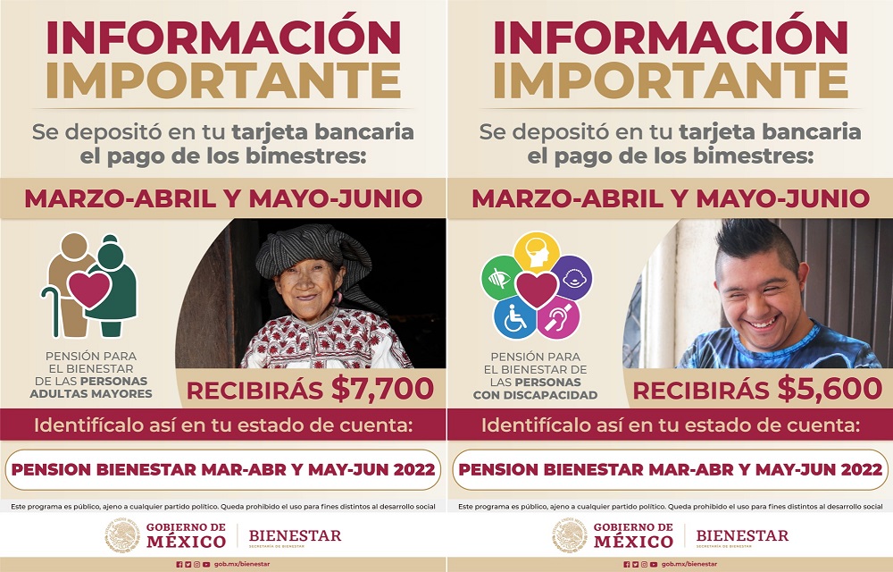 La Secretaría de Bienestar informa que el día hoy se realizó la dispersión de los Programas y Pensiones del Bienestar correspondiente a los bimestres marzo-abril y mayo-junio, para derechohabientes que cobran a través de tarjetas bancarias.