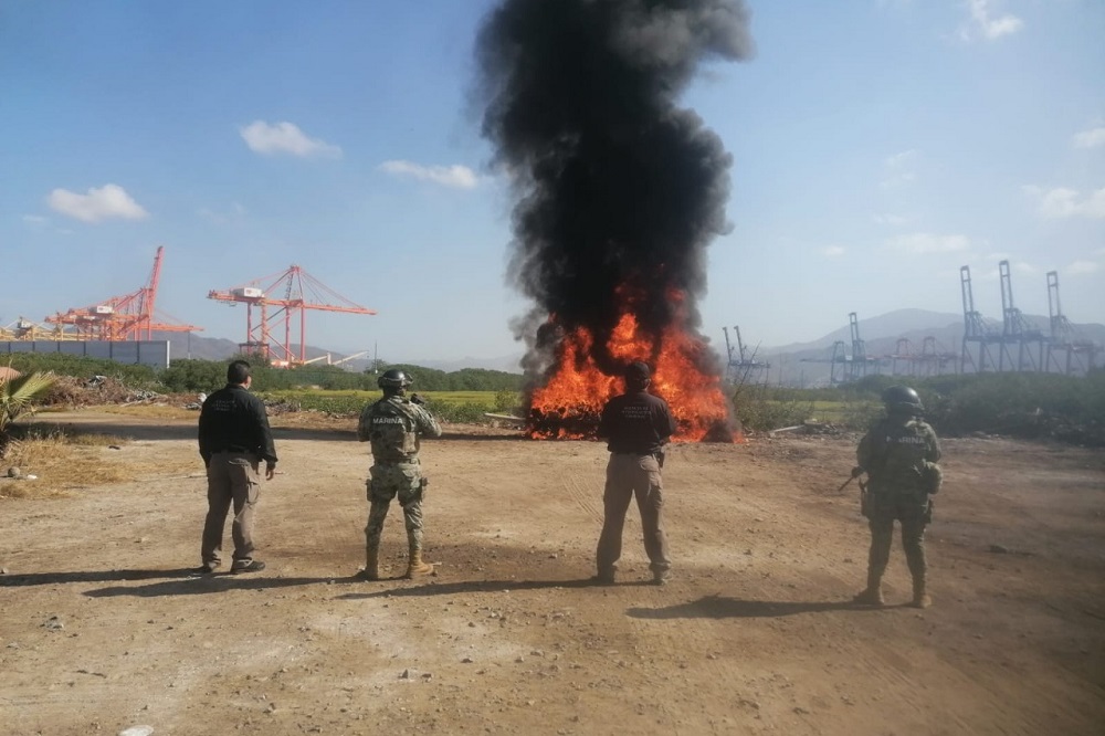 Manzanillo, Col. Como parte del Plan Nacional de Paz y Seguridad 2018-2024, la Secretaría de Marina y la Fiscalía General de la República, el pasado 9 de marzo llevaron a cabo la incineración de aproximadamente 1 mil 621 kilogramos de clorhidrato de cocaína y la destrucción de 37 bidones de plástico asegurados, estos últimos utilizados para el transporte de hidrocarburos.