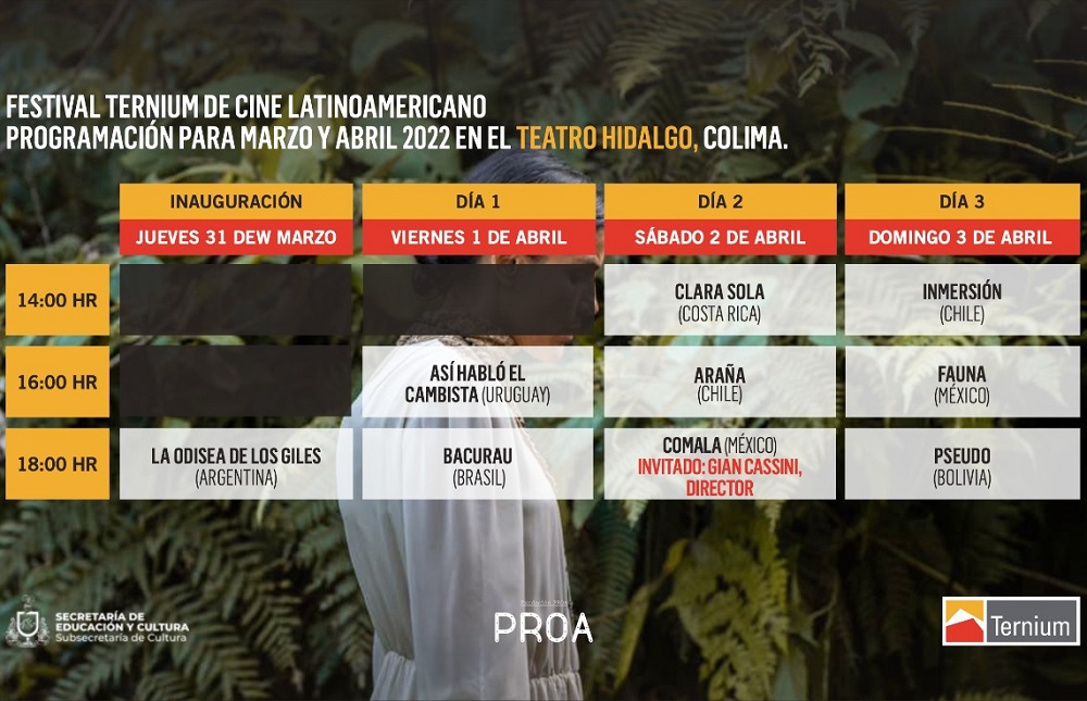Jueves 31 de marzo a las 18:00 horas se proyectará la película Odisea de los Giles; viernes 1 de abril a las 16:00 horas estará la película uruguaya "Así habló el cambista" y a las 18:00 horas "Bacurau" de Brasil; el sábado inician a las 14:00 horas con el filme "Clara Sola", de Costa Rica, después "Araña", de Chile, y para finalizar el día presentarán “Comala” con el invitado Gian Cassini y el domingo 3 de marzo a las 14:00 horas se estará proyectando el filme "Inmersión", de Chile, continuando con "Fauna", mexicana y cerrando la edición con la película "Pseudo" de Bolivia.