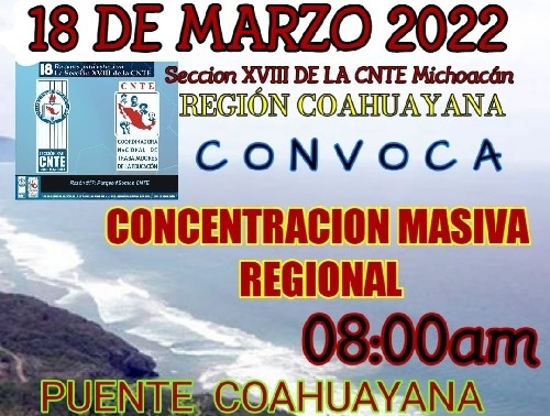 Coahuayana, Mich. La Sección XVIII de la Coordinadora Nacional de Trabajadores de la Educación, CNTE, a través de sus redes sociales y mensajes de whatsapp está convocando a sus afiliados para este viernes 18 de marzo a una concentración masiva regional de maestros de los municipios de Aquila, Coahuayana y Chinicuila, la que se llevaría a cabo en la carretera federal México 200, en el puente que une a los estados de Michoacán y Colima.