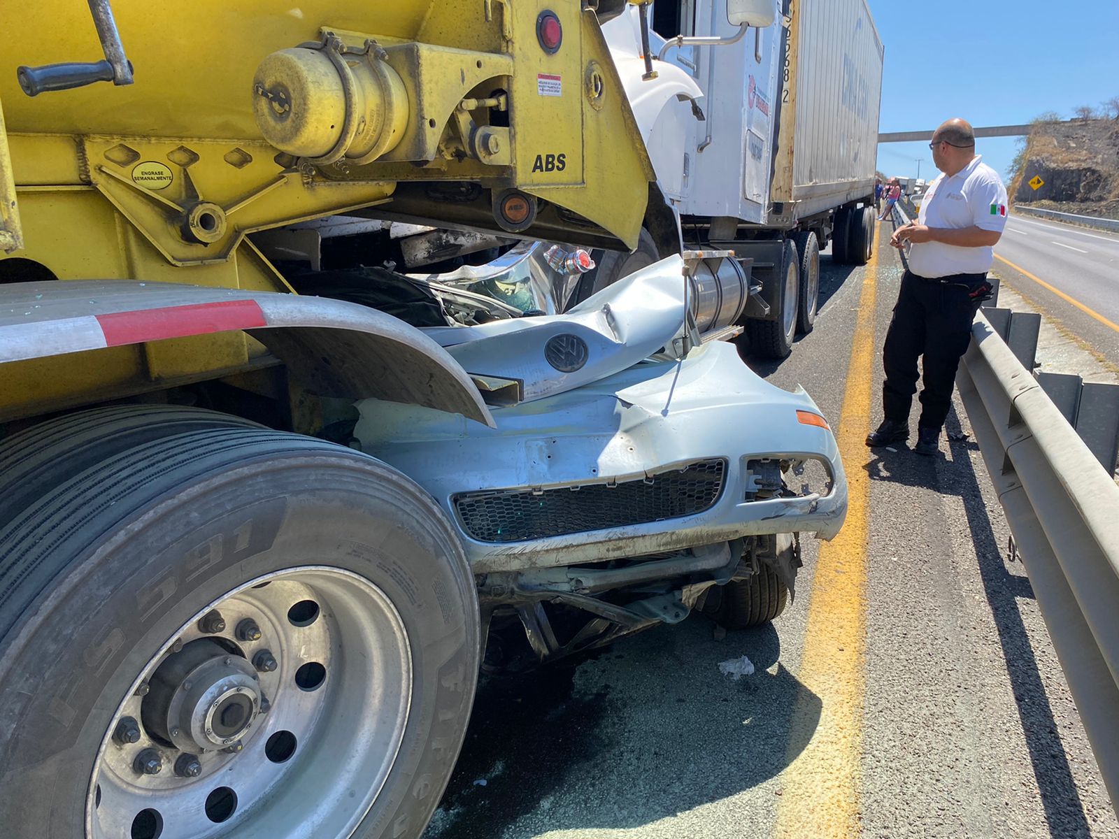 Luego de que se vieran involucrados cuatro tractocamiones, dos vehículos sedán y una camioneta, en donde uno de ellos, marca Volkswagen tipo Beetle color plata quedara prensado entre dos tráileres, acudieron elementos de diferentes corporaciones de auxilio y socorro de los estados de Colima y Jalisco.
