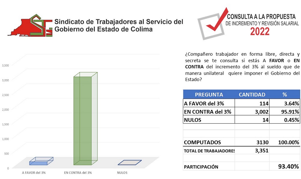 Luego de una copiosa asistencia de sindicalizados a la consulta para aprobar o no la propuesta del gobierno estatal del 3 por ciento de aumento salarial, más del 95 por ciento de ellos rechazaron la propuesta.