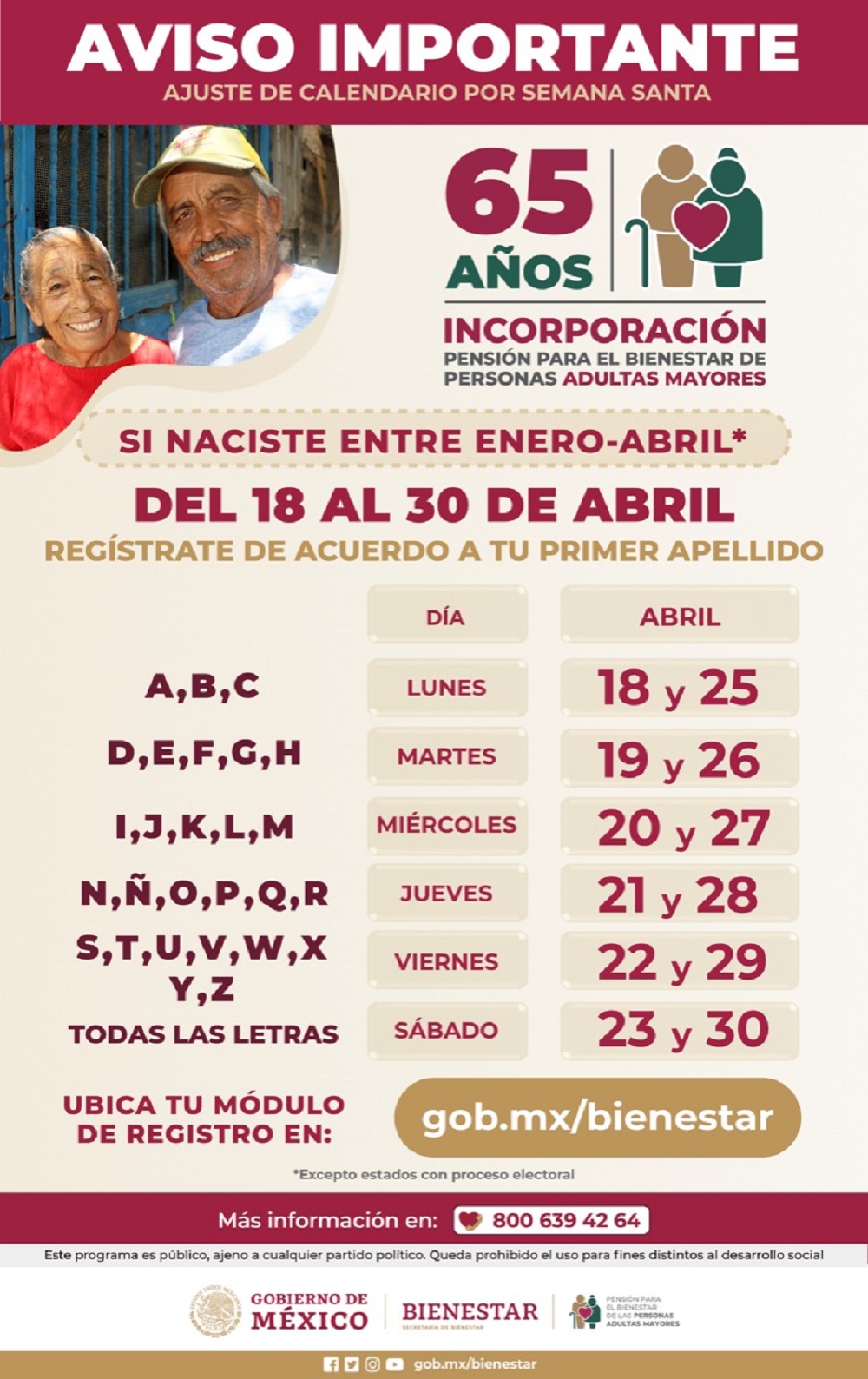 El registro se hará de acuerdo con el primer apellido de la persona adulta mayor, exceptuando los estados que cursan proceso electoral.