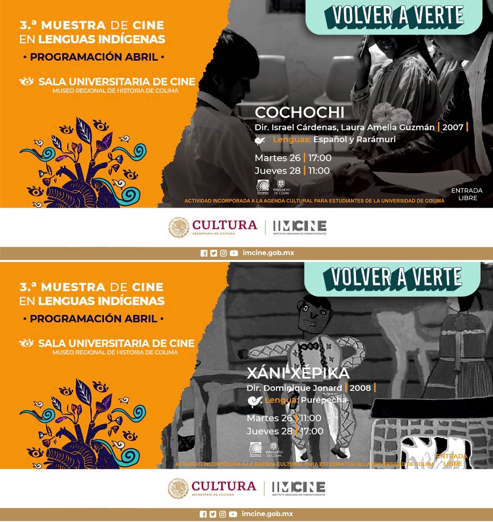 Los títulos a proyectarse son los siguientes: Cocochi (2007), de Israel Cárdenas y Laura Amelia Guzmán, martes 26 a las 17:00 horas y jueves 28 a las 11:00 horas; Yollot (2020), del director Fernando Colín Roque, martes 26 a las 17:10 y jueves 28 a las 11:10 horas; Xáni Xépica (2008) de Dominique Jonard, martes 26 a las 11:00 horas y jueves 28 a las 17:00 horas.