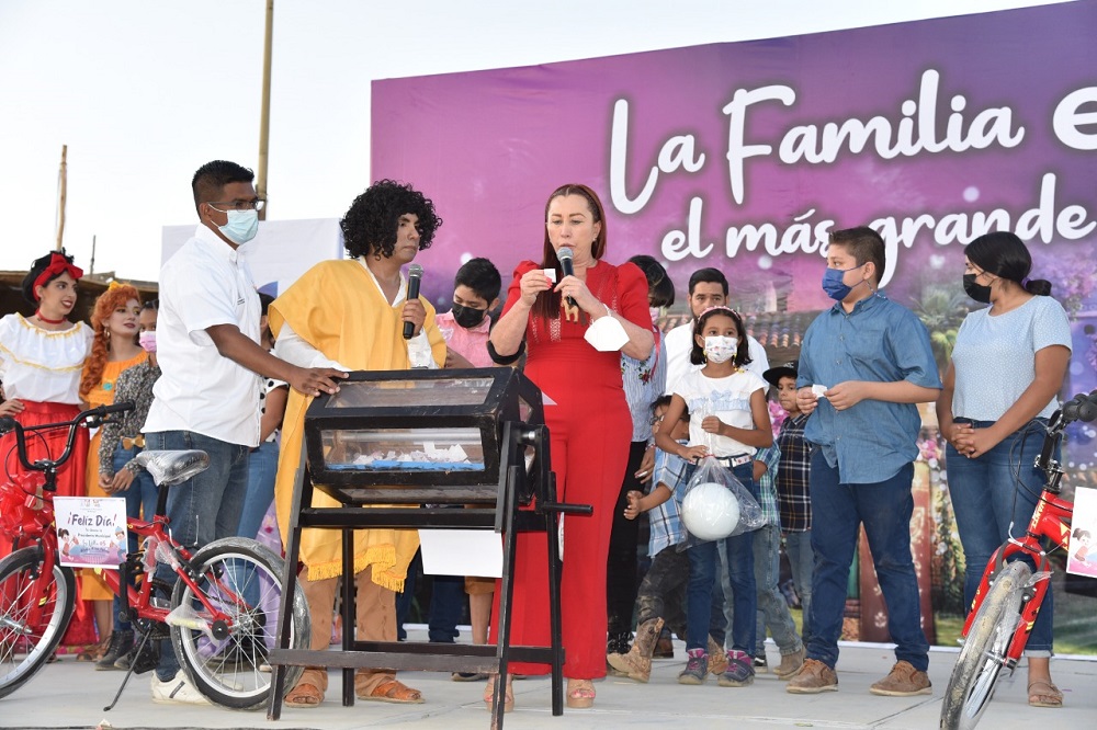 Previo y al final de la presentación del show de Encanto, la Alcaldesa Tey Gutiérrez; el Síndico José Santos; Regidoras y Regidores, y miembros del Cabildo Infantil, rifaron regalos, juguetes, pelotas, balones y bicicletas entre las niñas y niños asistentes.