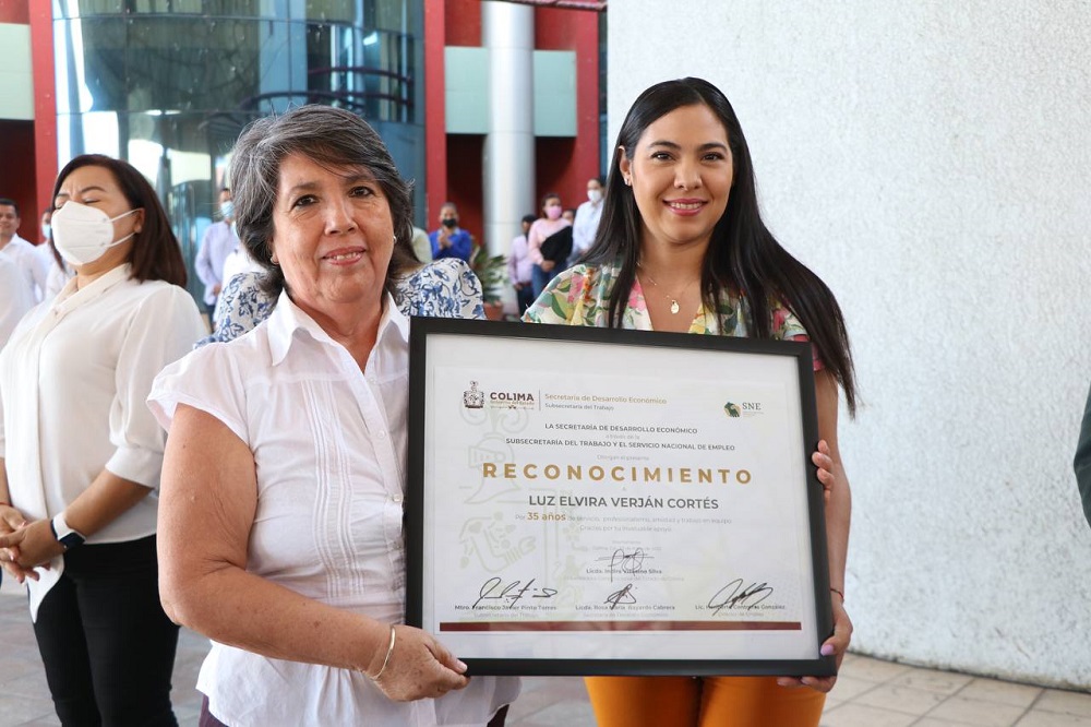 La Gobernadora entregó un reconocimiento especial a Luz Elvira Verján Cortés, por 35 años de servicio y profesionalismo en el Servicio Nacional de Empleo Colima.