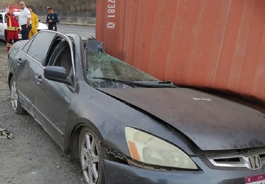 Al llegar las autoridades se percataron que, al parecer, al tomar una curva el conductor de un tracto camión acoplado a semirremolque tipo porta contenedor, perdió el control del volante, lo que ocasionó que el pesado camión saliera del camino volcándose y cayendo el contenedor sobre un automóvil marca Honda, tipo Accord, al que arrastró varios metros.