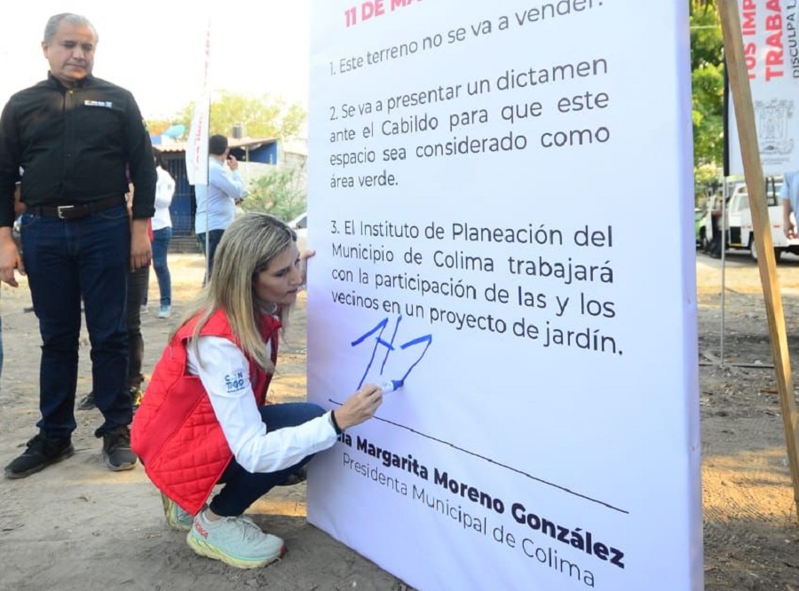 La presidenta municipal de Colima, Margarita Moreno, firmó una serie de compromisos para beneficiar directamente a las y los vecinos de la colonia Prados del Sur, entre los que destaca la preservación de un predio, su conversión en área verde y diseño de un proyecto de jardín.