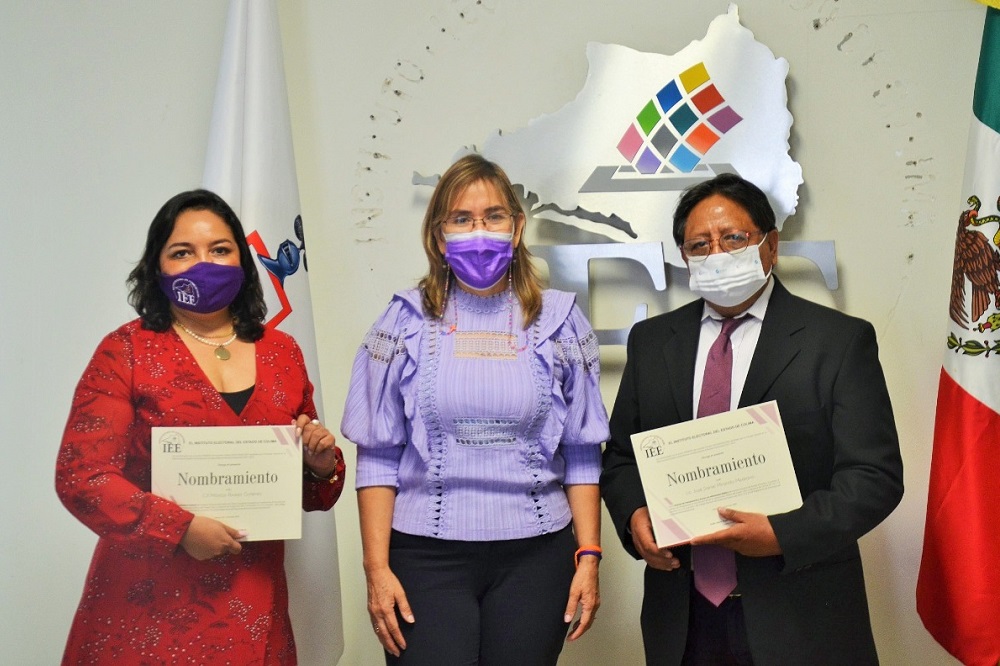 La Consejera Presidenta del Instituto Electoral del Estado de Colima (IEE), María Elena Adriana Ruiz Visfocri; les tomó la protesta de ley a la ciudadana Mónica Álvarez Gutiérrez y al ciudadano José Daniel Miranda Medrano, como Contadora General y Director de Transparencia y Acceso a la Información Pública, respectivamente, del órgano electoral local.