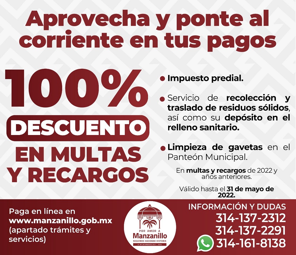 En apoyo de la economía de las y los manzanillenses, el Ayuntamiento descontará la totalidad de multas y recargos de diversos impuestos. Este beneficio será válido hasta el 31 de mayo, así lo informó el director de Ingresos Carlos Cervantes Briseño.