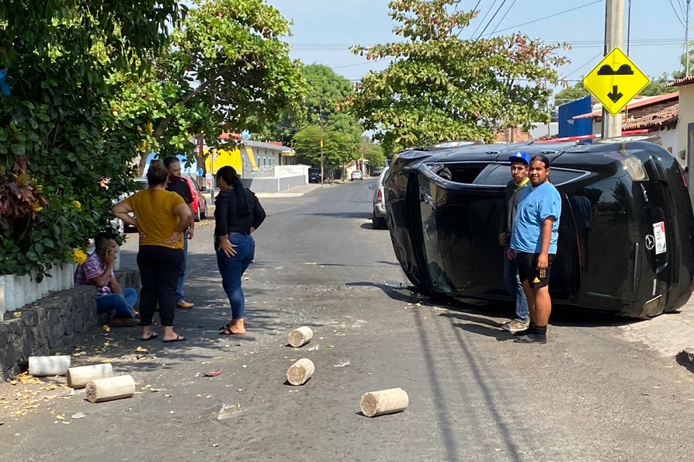 Debido al impacto, el conductor perdió el control del volante y la unidad terminó volcada sobre la calle.