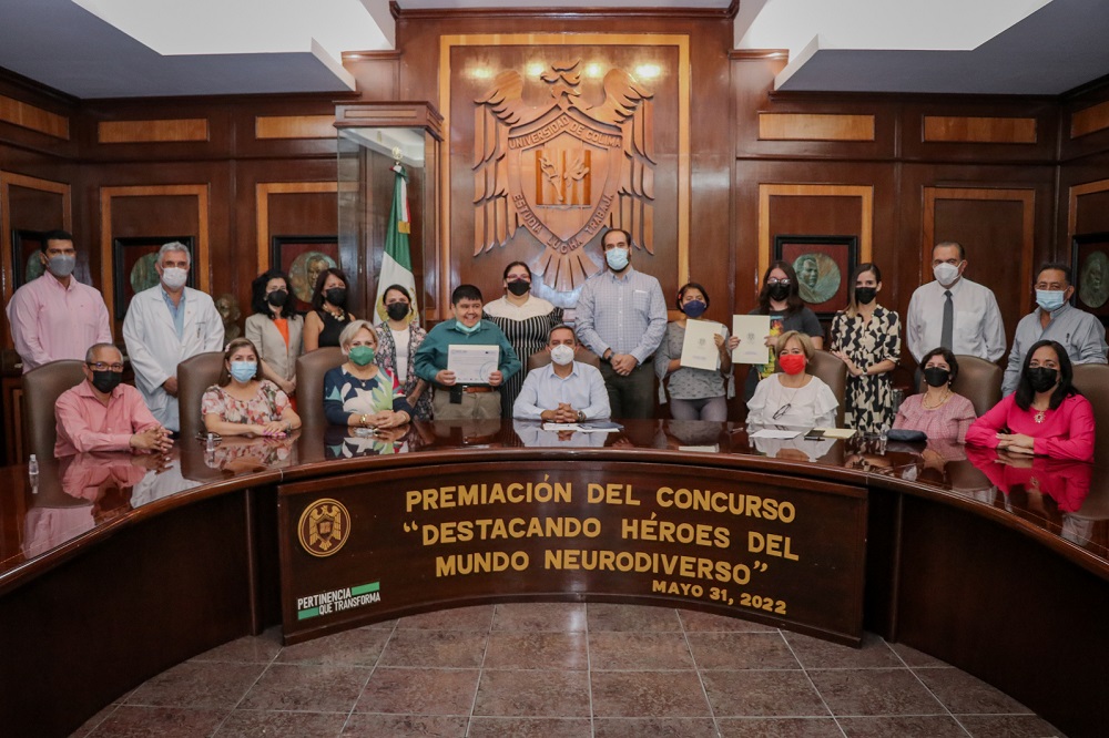 Al mediodía de este martes, en la sala de juntas de Rectoría, Christian jorge Torres Ortiz Zermeño, rector de la Universidad de Colima entregó los premios a los ganadores del concurso “Destacando héroes del mundo neurodiverso”. Ellos son: Carmen Figueroa Flores y Grecia Preciado Chávez (primer lugar en equipo), Kenia Silva Zúñiga (segundo lugar en modalidad individual); Mariana Valdovinos Farías y Jesús Aguilar Salazar (tercer lugar en modalidad en equipo), y Jorge Arriaga Benhumea, quien recibió mención honorífica por su trayectoria personal.