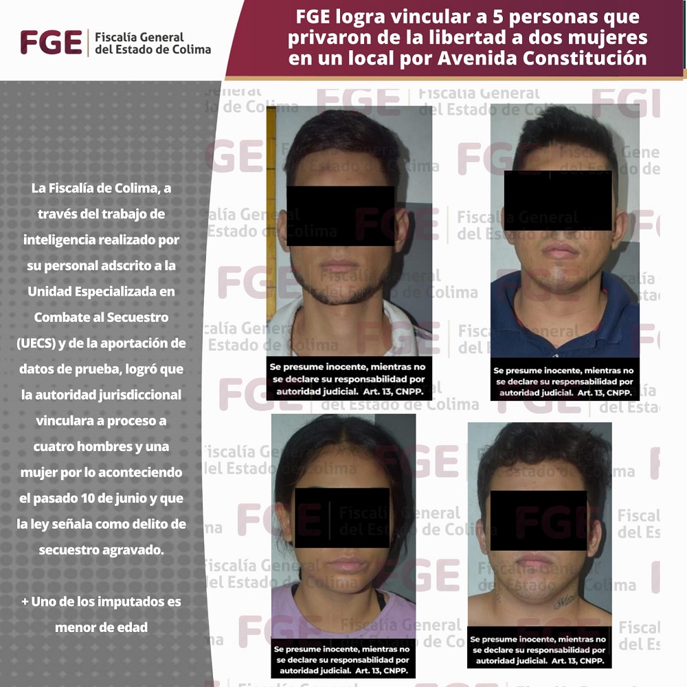 La Fiscalía de Colima, a través del trabajo de inteligencia realizado por su personal adscrito a la Unidad Especializada en Combate al Secuestro (UECS) y de la aportación de datos de prueba, logró que la autoridad jurisdiccional vinculara a proceso a cuatro hombres y una mujer por lo aconteciendo el pasado 10 de junio y que la ley señala como delito de secuestro agravado.
