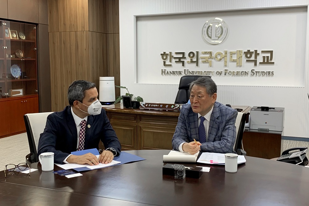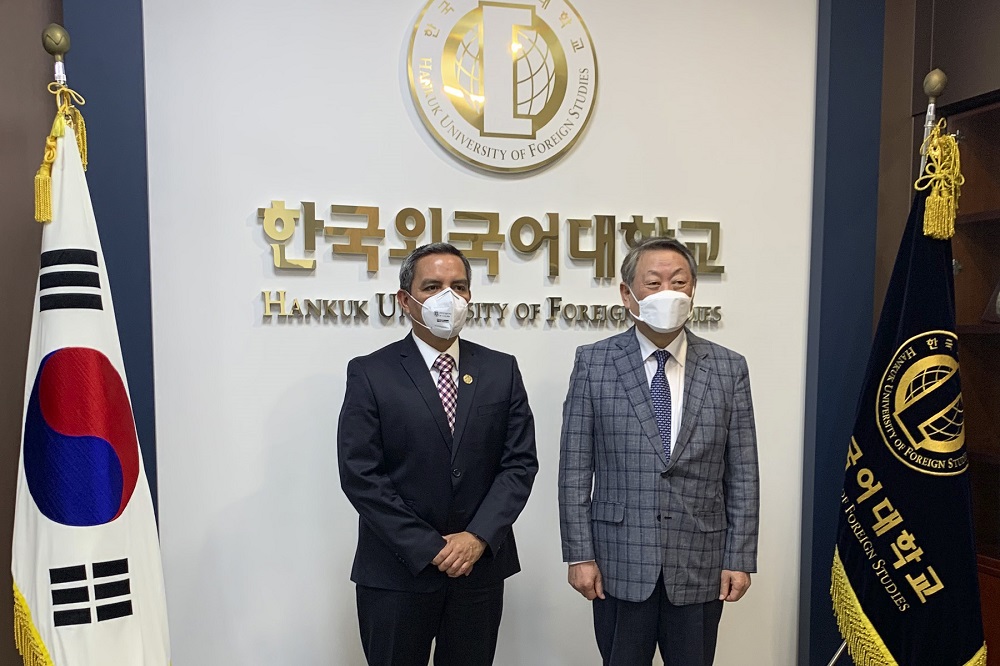 En la Hankuk University of foreign Studies (HUFS), el rector colimense se entrevistó con su homólogo, el rector Dr. Jeong-Woon Park, quien estuvo acompañado por el decano de Relaciones Internacionales, Dr. Jaewan Yang y el Jefe del departamento de español, el Prof. Namkwon Moon.