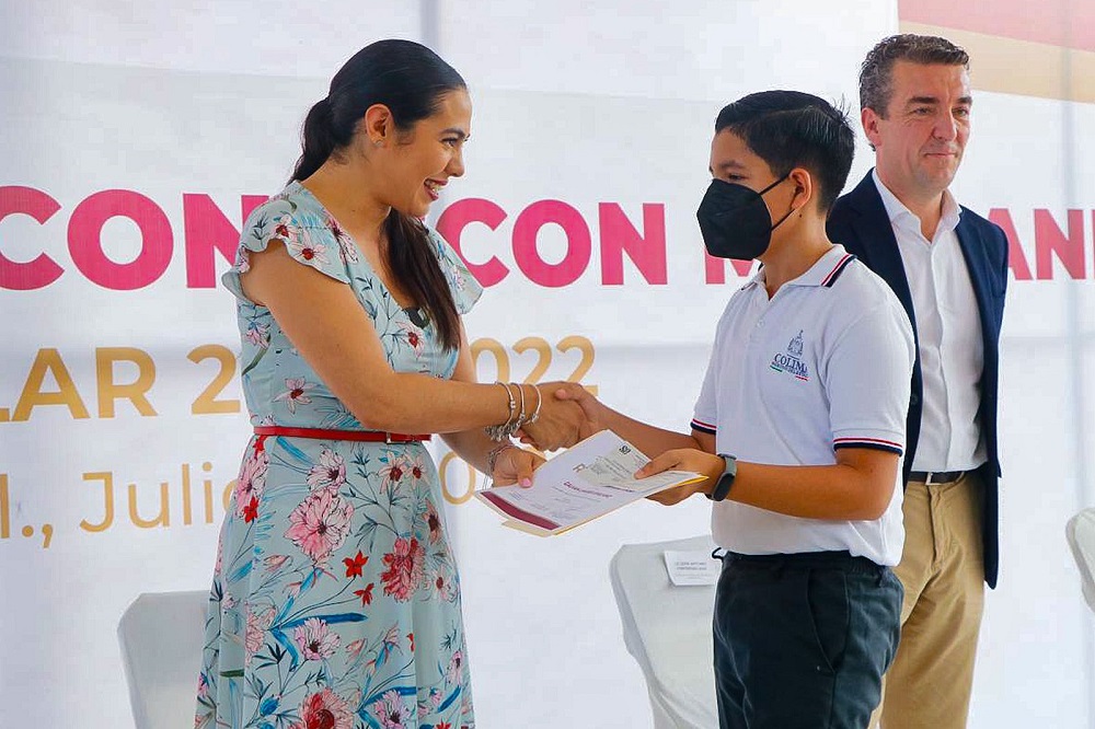 Así lo resaltó al participar en la entrega de Becas de Excelencia Contecon 2022, a 17 estudiantes de sexto grado de primaria en la escuela Basilio Vadillo de Manzanillo, donde estuvo acompañada por el secretario de Educación y Cultura, Adolfo Núñez González; el director general de Contecon Manzanillo, José Antonio Contreras Ruiz; el jefe de Responsabilidad Social Corporativa de esta empresa, Francisco Santana Roldán y la directora del plantel, Luxiola Cárdenas Alcaraz.