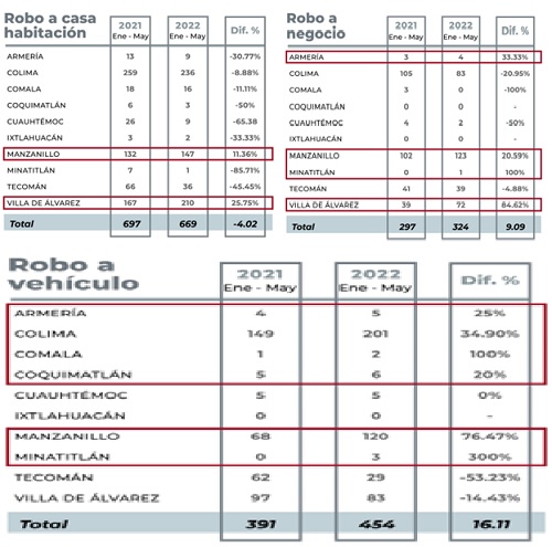En cuanto a los robos contra negocios en la entidad, la incidencia de este delito aumentó un 9.09%, pasó de 297 robos a negocios en el 2021 a 324 para el periodo de enero - mayo 2022. Del total de robos contra negocio, en 19 casos se hizo uso de violencia, 3 menos que los registrados durante el 2021 (22), estos robos ocurrieron 2 en el ayuntamiento de Colima, 3 en Villa de Álvarez y 14 en Manzanillo.